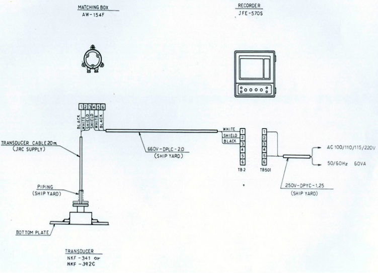 测深仪俗称声纳。声波的频率20Hz以下称为次声波;20-20kHz之间是可听声波;20kHz以上是超声波。为避免水中生物和机械震动声波引起干扰,船舶测深仪使用超声波。采用声波在水中传播匀速及反射的原理,通过发射和接收声波的时间转换成距离(深度)信号,用记录器和数字显示器直接显示船底到水底间的距离(深度),也可以快速加上吃水,计算和显示水面到水底的距离(深度)。常用的测深仪发射频率有200kHz和50kHz及38kHz三种,频率越低能探测的深度越大,两种不同频率的测深仪发射机和换能器必须是匹配的,不能互换。例如SKIPER公司生产的ED-161是50KHZ,ED-162是200KHZ,日本JRC公司生产的FE-570 SF是50KHZ,FE-570 S是200KHZ;当设备出现没有水深数字显示同时记录器上无打印时,可以如下作如下判断,压下标志线开关,此开关压下后在记录器上打下一条标志线,是用来计算起始时间标记的,压下后记录器无反应,即不能打印出标记线,则说明接收机和记录器有故障;要注意一下皮带上的记录针是否磨损和脱离,同时还需注意一下导电刷是否接触良好;特别要提醒注意的是,当你需要打开机器检查或更换记录纸时,请将皮带上的记录针往下转到背后,防止不慎将记录针碰掉或损坏;当船舶进厂修理时,切记要在进坞前,将测深仪换能器在船底的准确位置告知厂方,防止座墩后压坏换能器。
