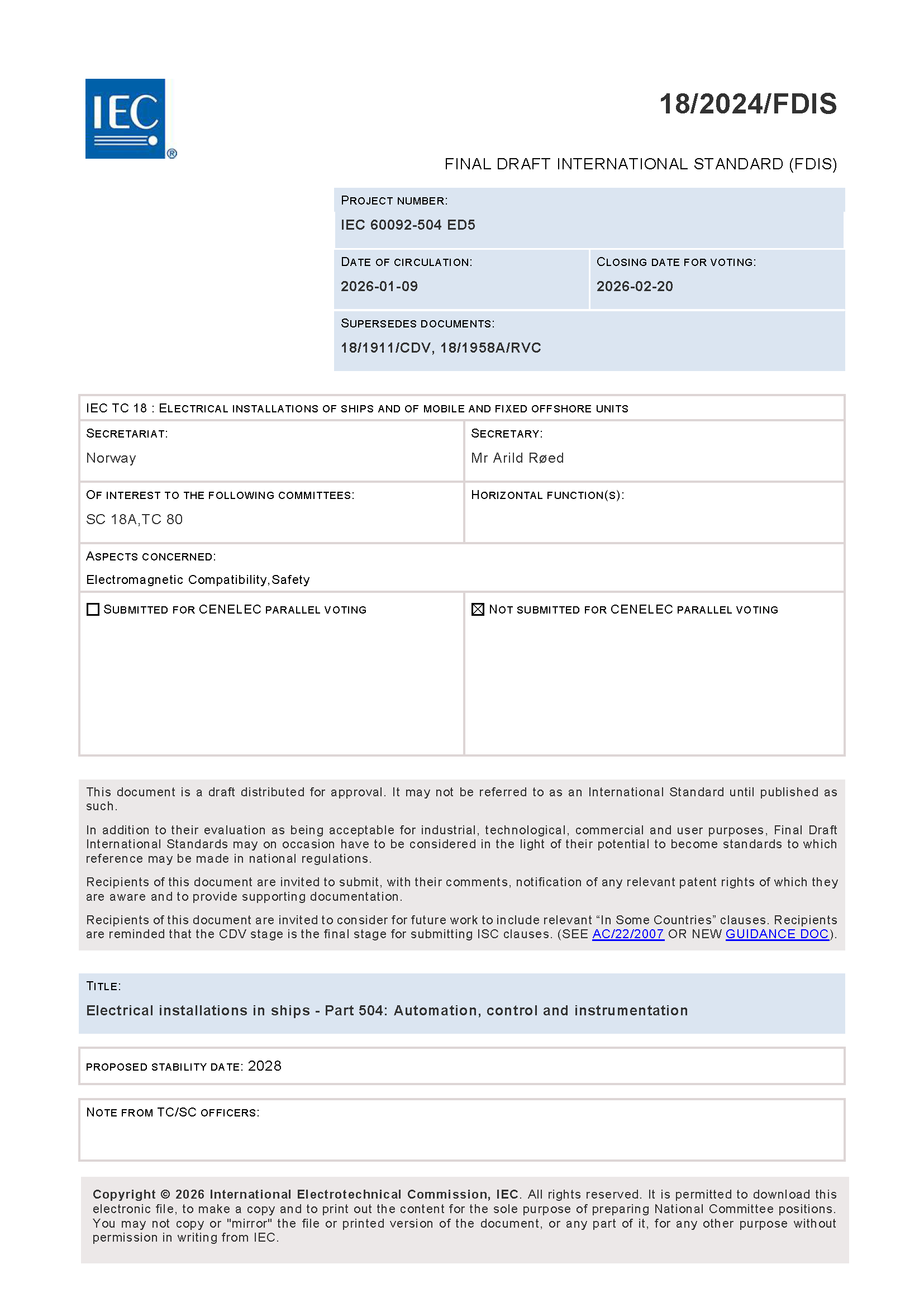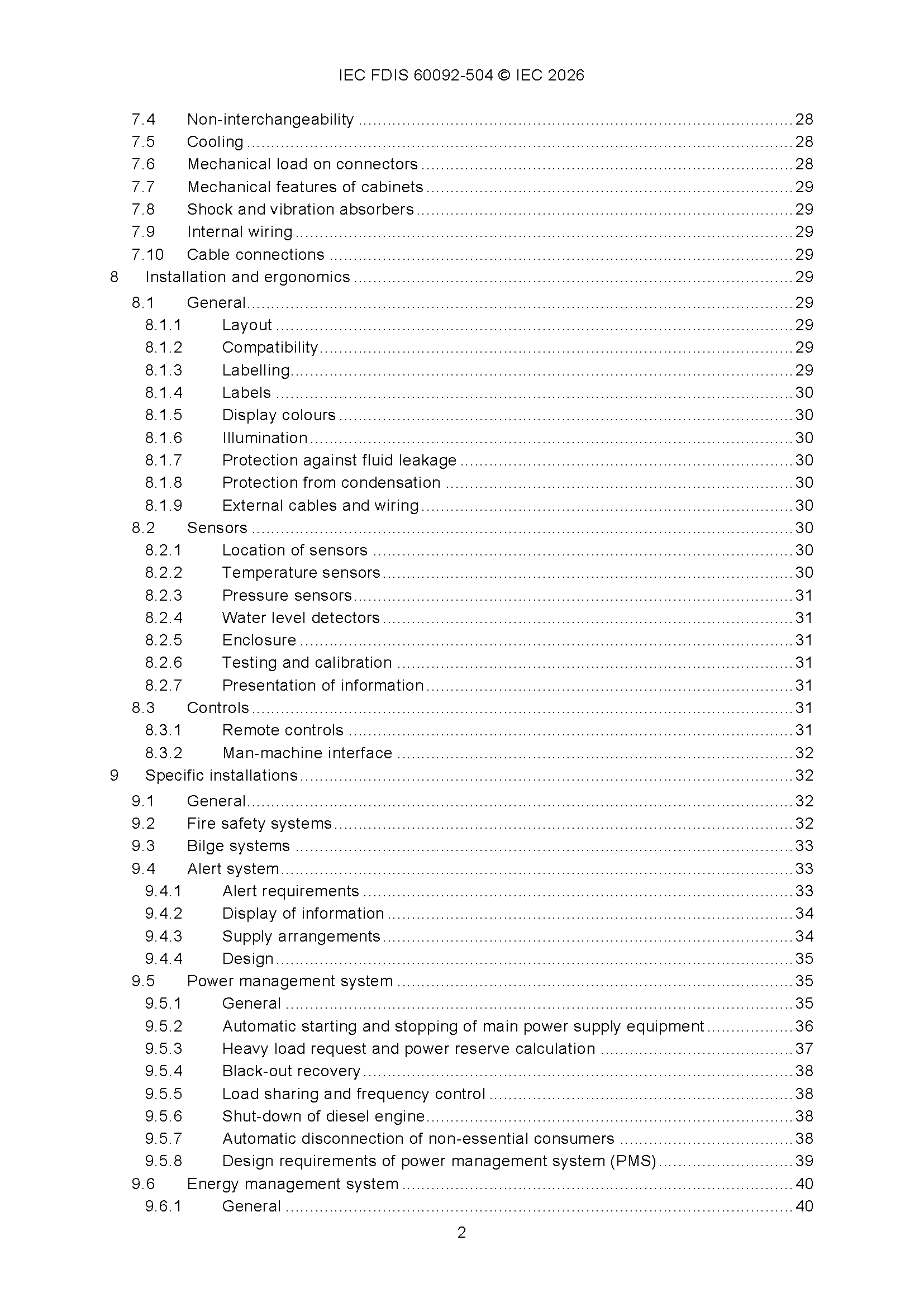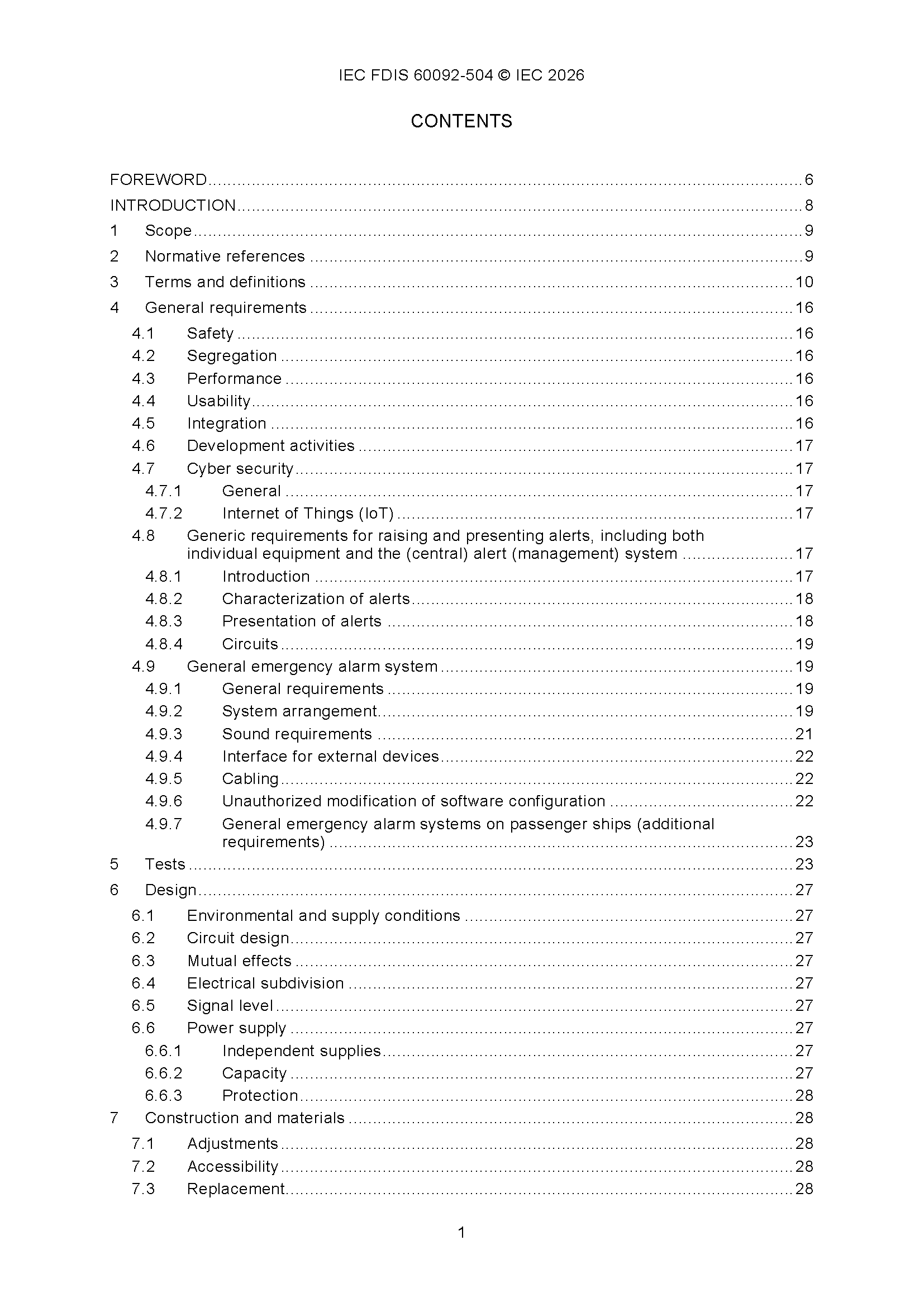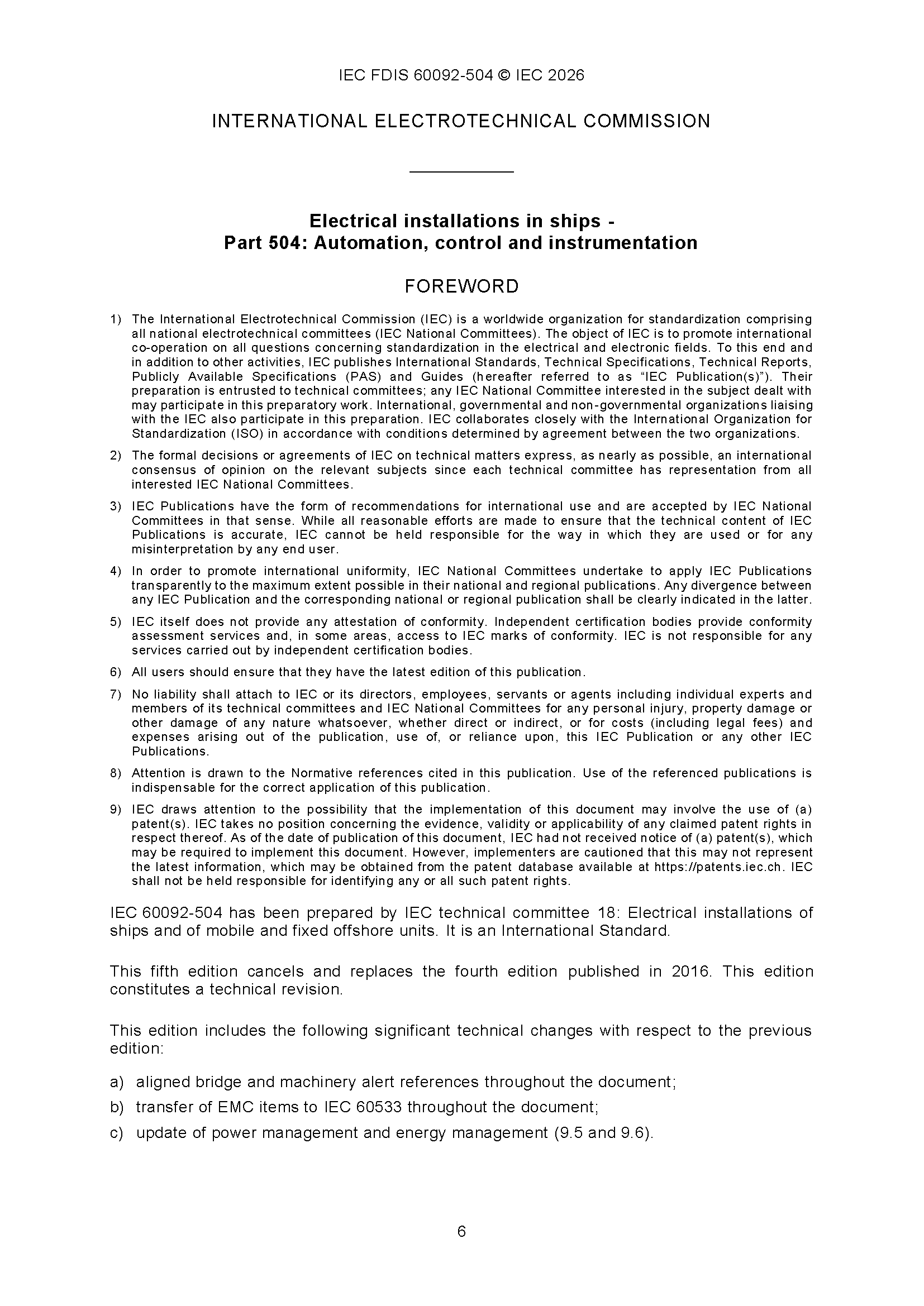 IEC 60092-504 (01-2026)(Ed5.0) Electrical Installations in Ships – Part 504 Automation, Control and Instrumentation 船舶电气设备 - 第504部分 自动化、控制和仪表