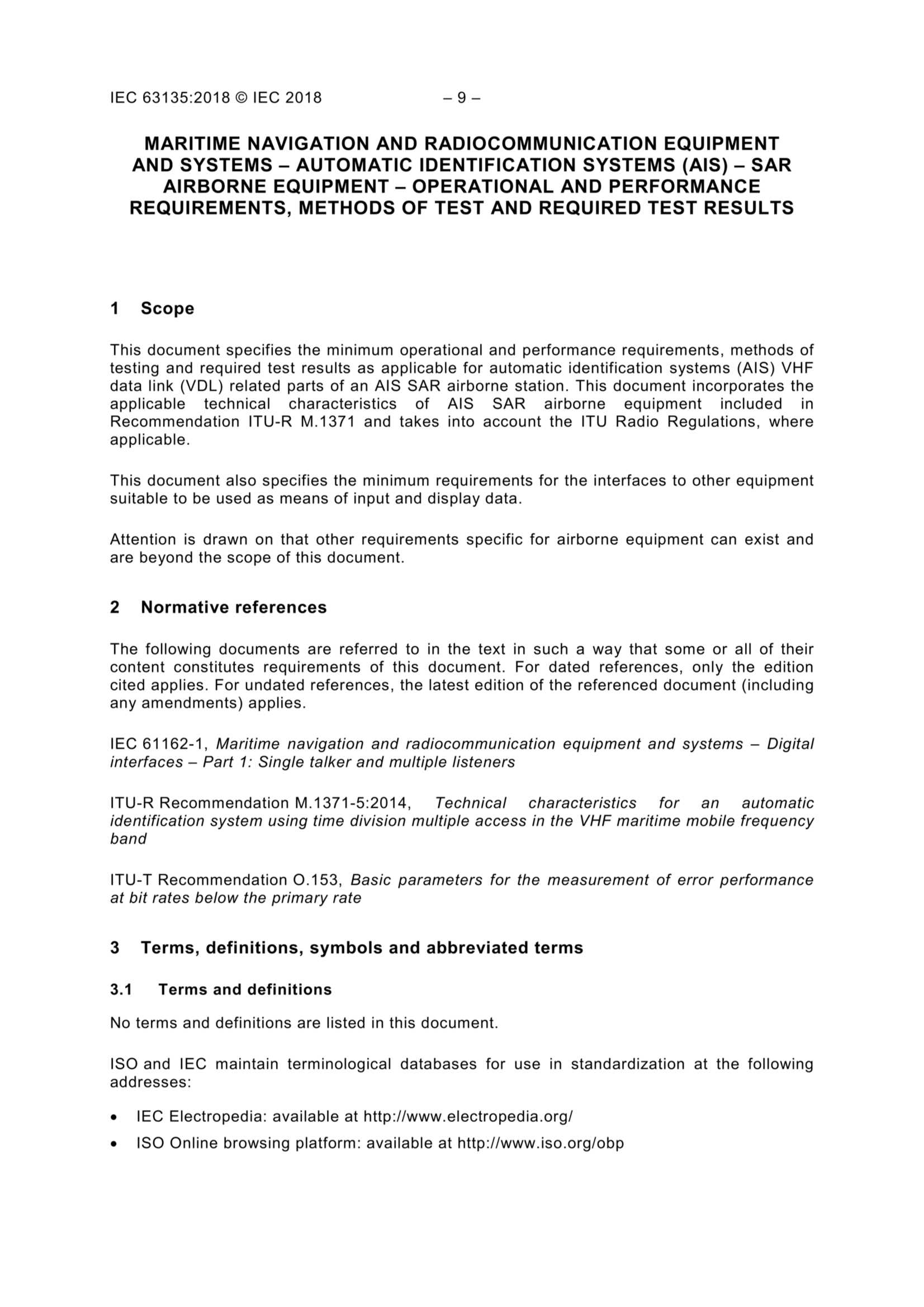 IEC 63135 (2018)(Ed1.0) Maritime Navigation and Radiocommunication Equipment and Systems – Automatic Identification Systems (AIS) – SAR Airborne Equipment – Operational and Performance Requirements, Methods of Test and Required Test Results 海上导航和无线电通信设备及系统 - 自动识别系统(AIS) - SAR机载设备 - 操作和性能要求、测试方法和要求的测试结果