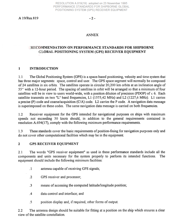 A.819(19) Performance Standards for Shipborne Global Positioning System (GPS) Receiver Equipment 船载全球定位系统(GPS)接收设备的性能标准 (Revised by MSC.112(73))