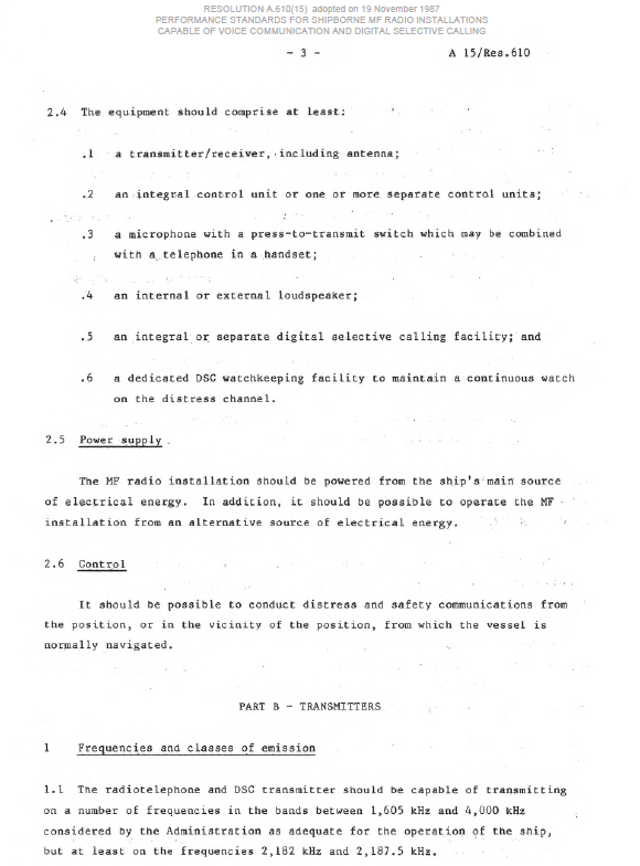 A.610(15) Performance Standards for Shipborne MF Radio Installations Capable of Voice Communication and Digital ive Calling 进行语音通信和数字选择性呼叫的船载中频无线电装置的性能标准 (Amended by A.804(19))