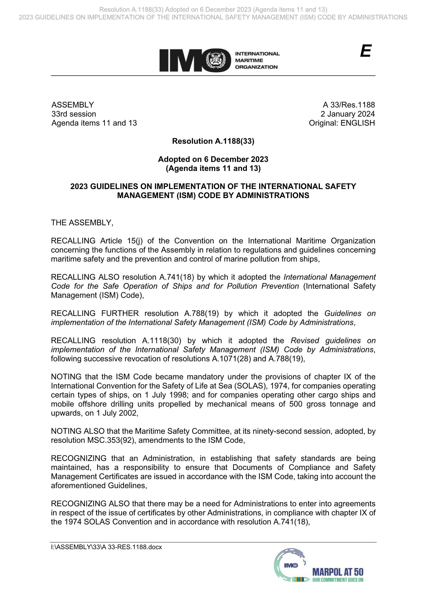 A.1188(33) 2023 Guidelines on Implementationof the International Safety Management (ISM) Code by Administrations 2023年主管机关实施国际管理(ISM)规则指南