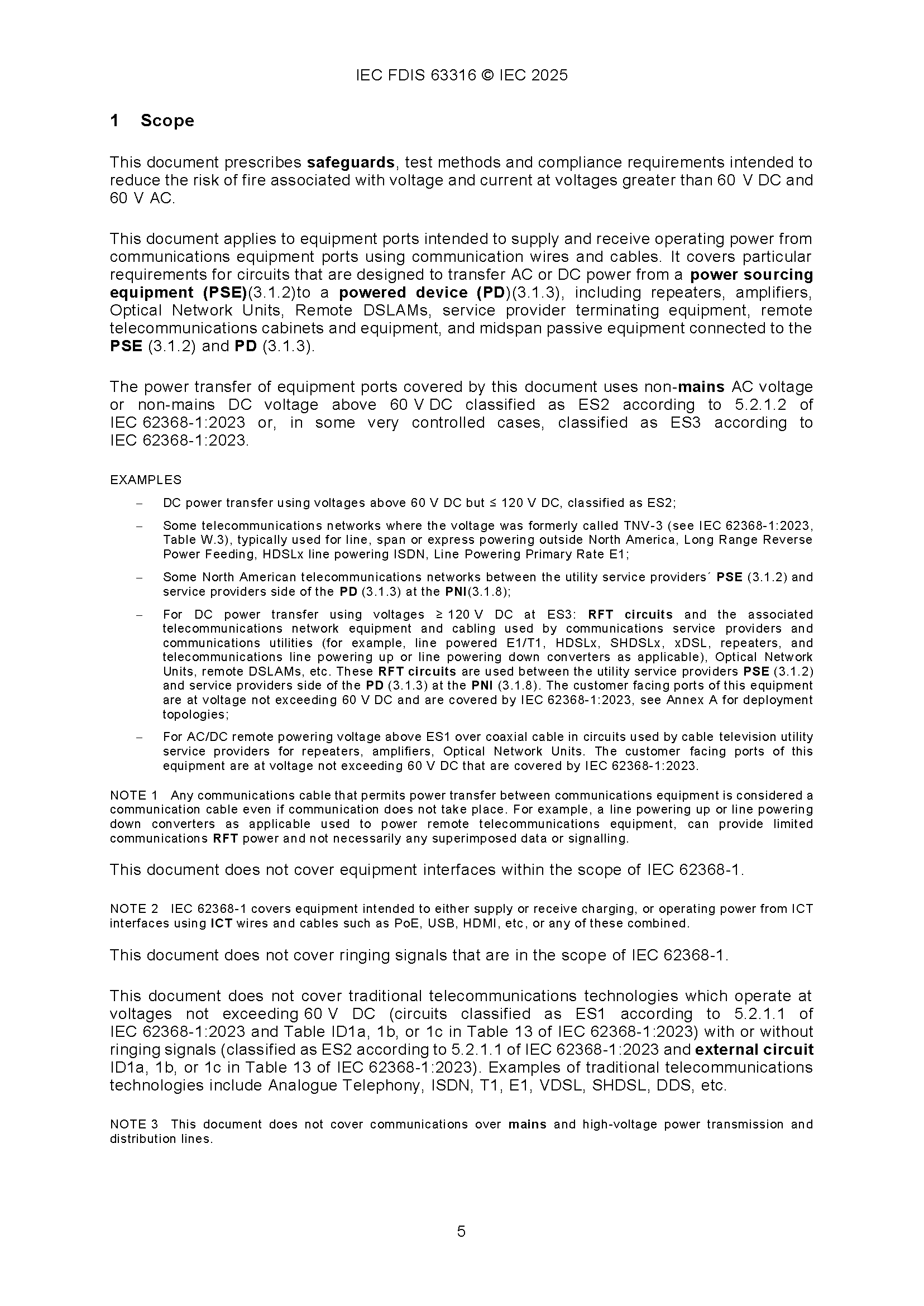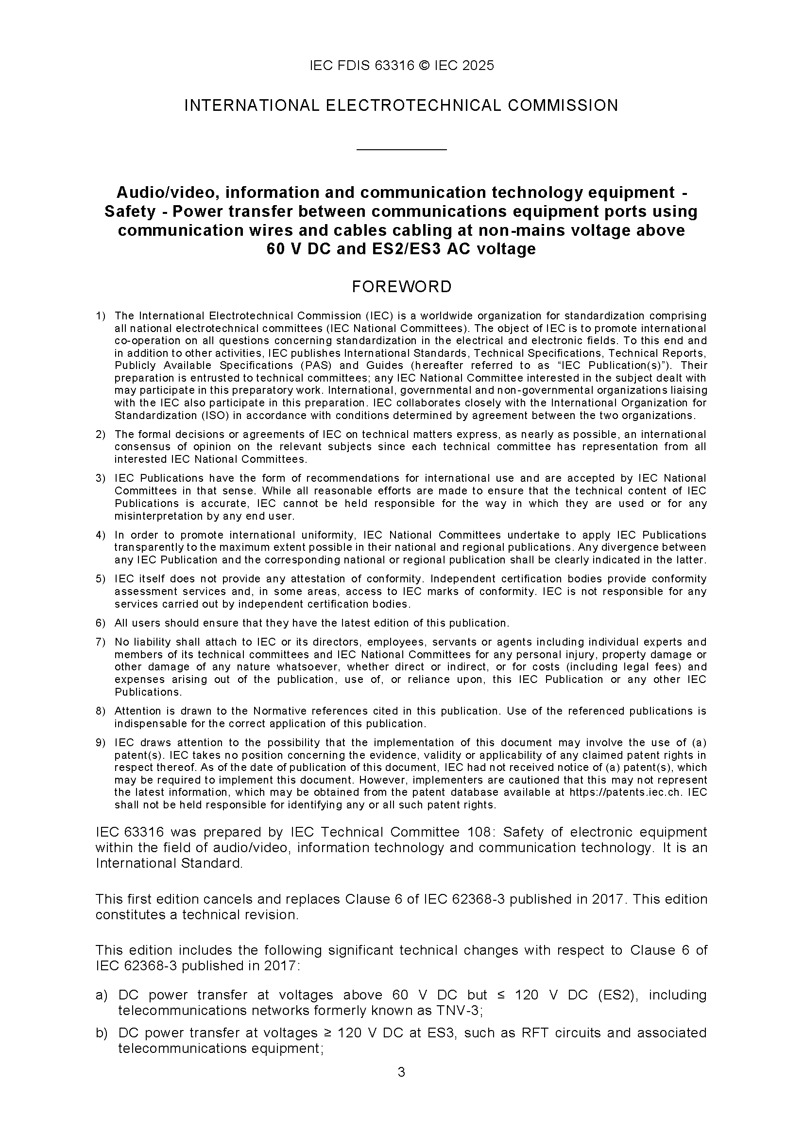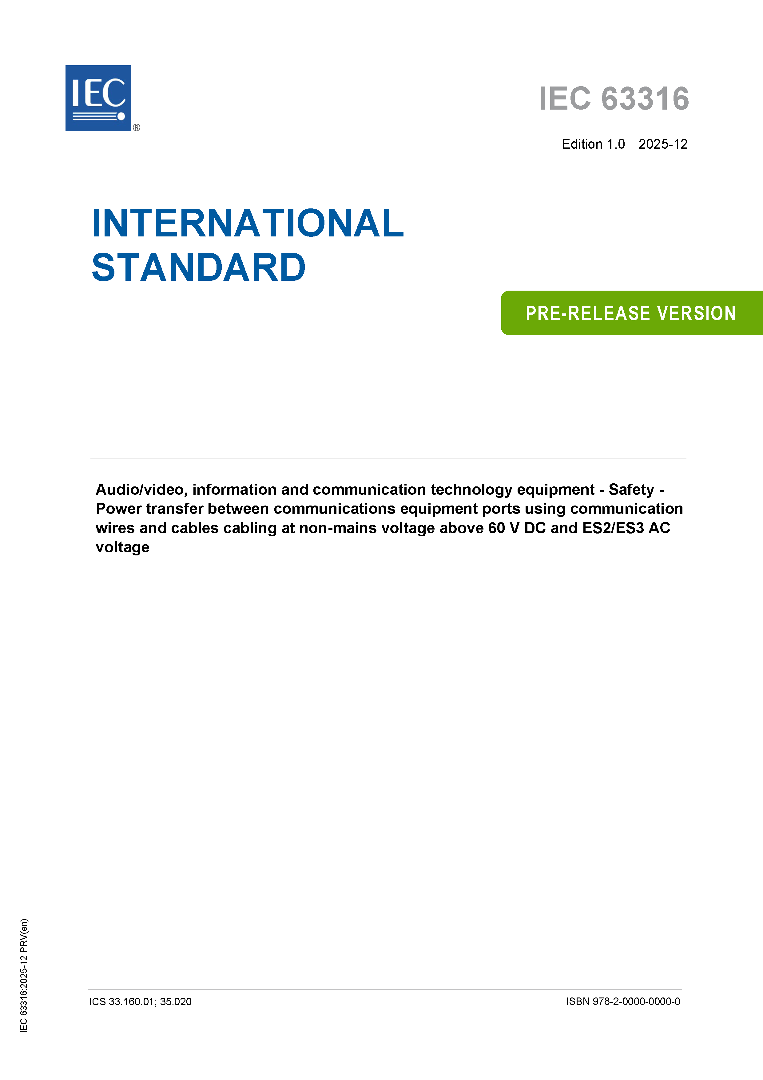 IEC 63316 (12-2025) Audio/video, Information and Communication Technology Equipment - Safety - Power Transfer Between Communications Equipment Ports Using Communication Wires and Cables Cabling at Non-Mains Voltage above 60V DC and ES2/ES3 AC Voltage 音频/视频、信息和通信技术设备 - 安全 - 使用通信电线和电缆在非市电电压高于60V DC和ES2/ES3 AC电压下进行通信设备端口之间的电力传输
