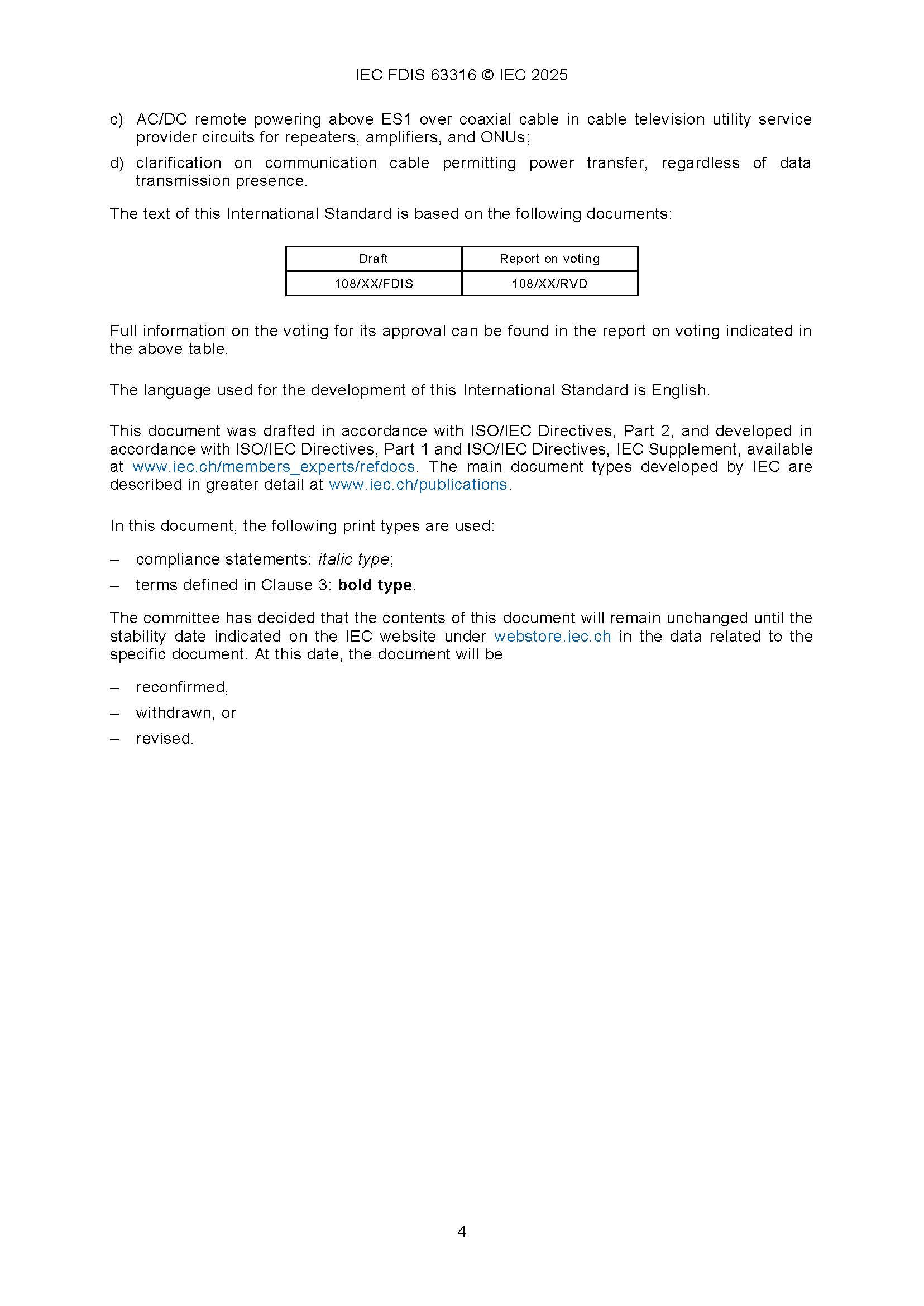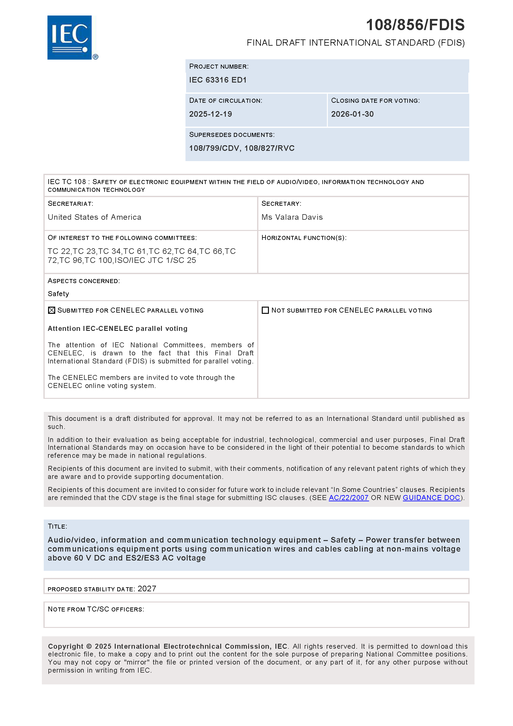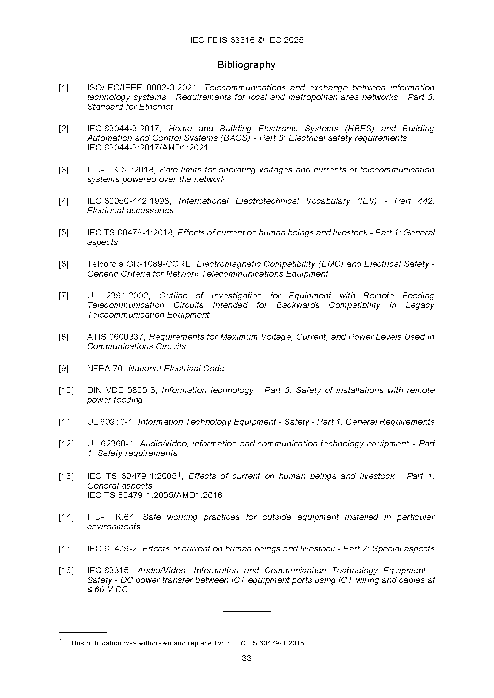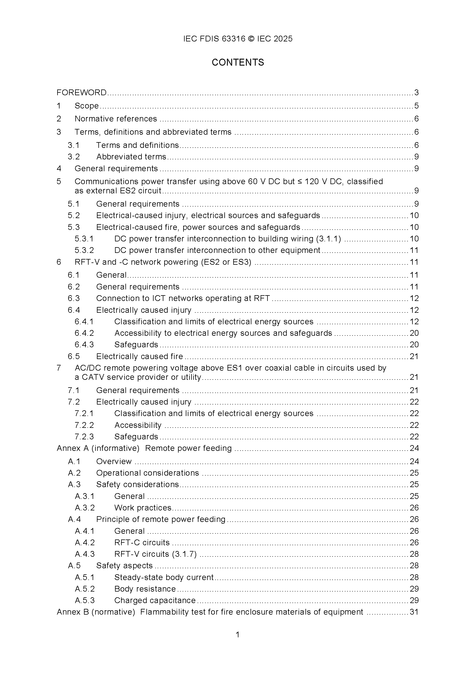 IEC 63316 (12-2025) Audio/video, Information and Communication Technology Equipment - Safety - Power Transfer Between Communications Equipment Ports Using Communication Wires and Cables Cabling at Non-Mains Voltage above 60V DC and ES2/ES3 AC Voltage 音频/视频、信息和通信技术设备 - 安全 - 使用通信电线和电缆在非市电电压高于60V DC和ES2/ES3 AC电压下进行通信设备端口之间的电力传输