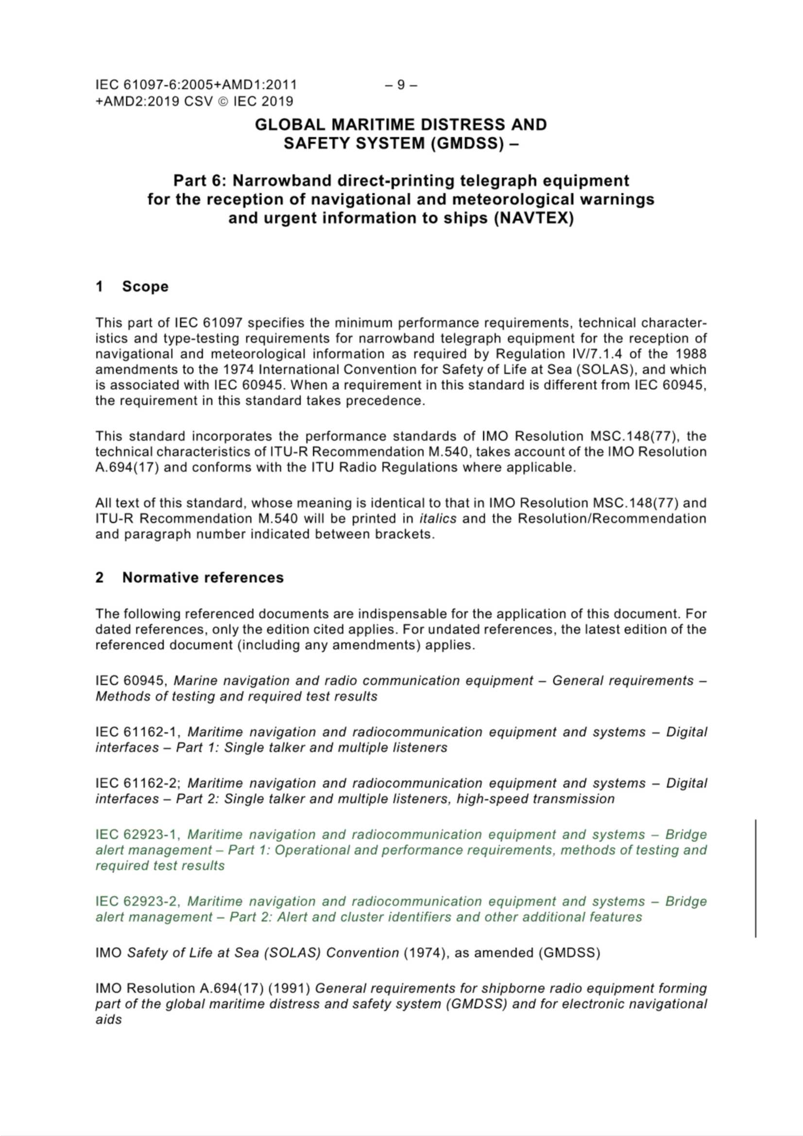 IEC 61097-6(2019)(Ed2.2 CSV) Global Maritime Distress and Safety System(GMDSS) - Part 6 Narrowband Direct-Printing Telegraph Equipment for the Reception of Navigational and Meteorological Warnings and Urgent Information to Ships(NAVTEX) 全球海上遇险与安全系统(GMDSS) - 第6部分 用于接收船舶航行和气象警告以及紧急信息(NAVTEX)的窄带直接印字电报(NBDP)设备