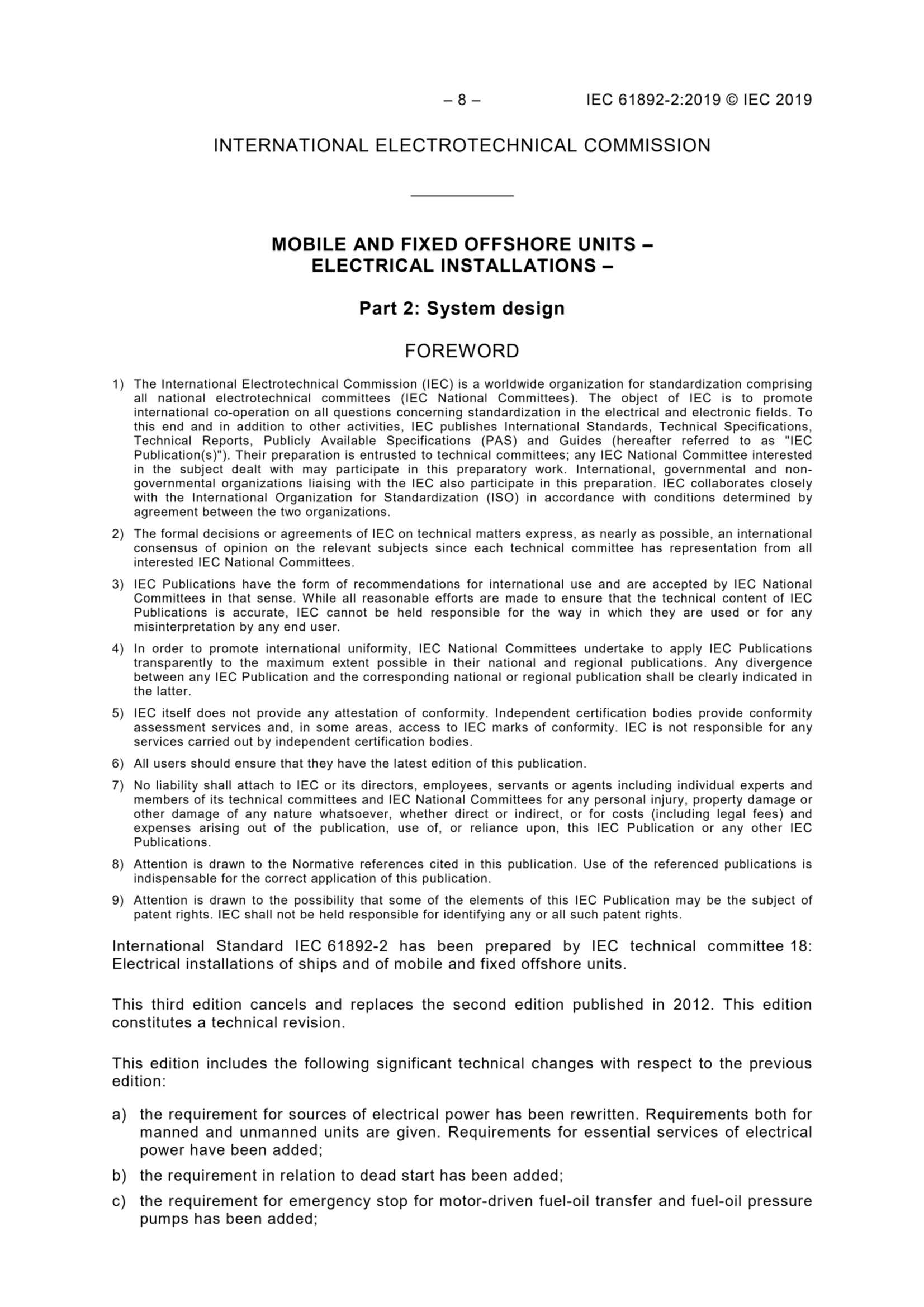 IEC 61892-2 (2019)(Ed3.0) Mobile and Fixed Offshore Units - Electral Installations - Part 2 System Design 移动式和固定式近海设施 - 电气装置 - 第2部分 系统设计